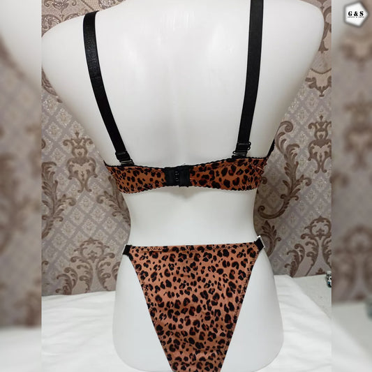 Stones Design Leopard Printed Pushup Bra With T-Panty Set