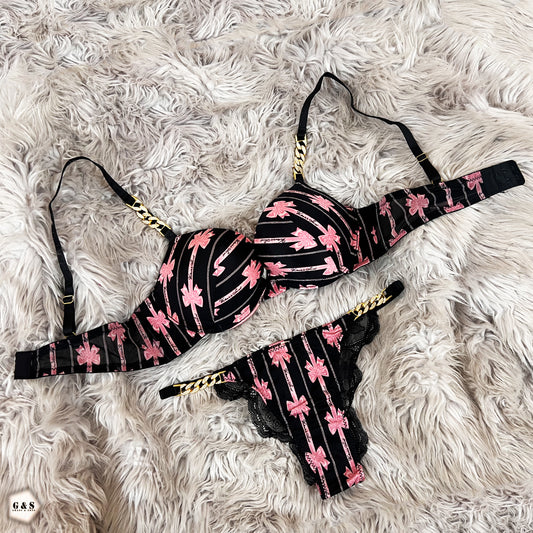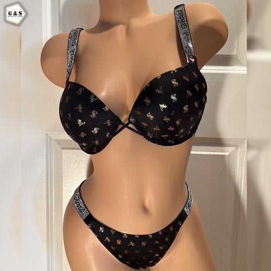 Stones Chain Design Printed Pushup Bra With T-Panty Set