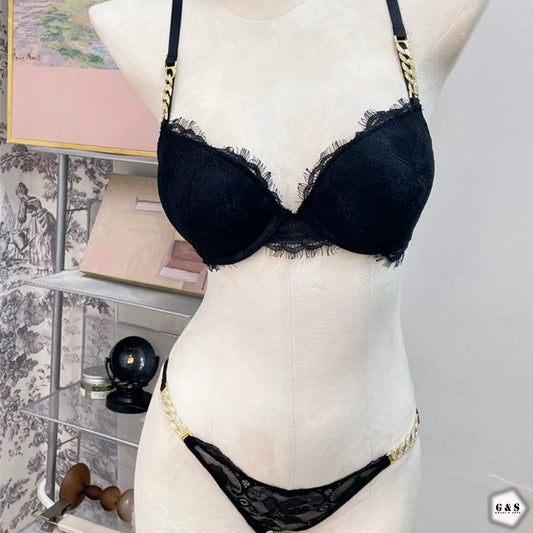 Stones Chain Lace Design Black Pushup Bra With T-Panty Set