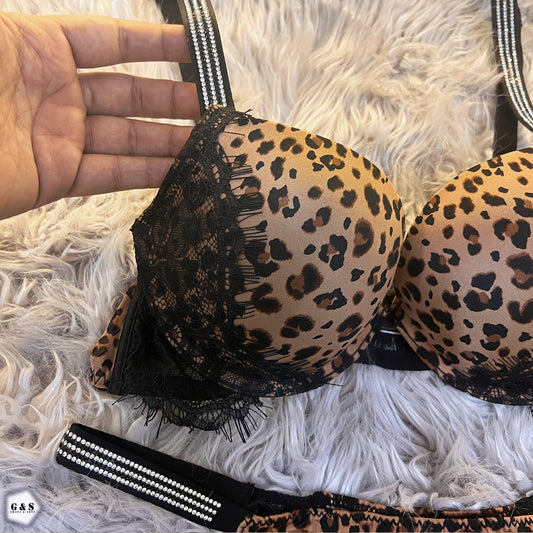 Stones Design Leopard Pushup Bra With T-Panty Set