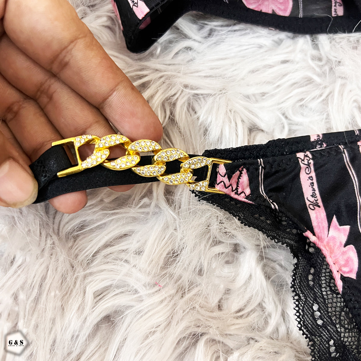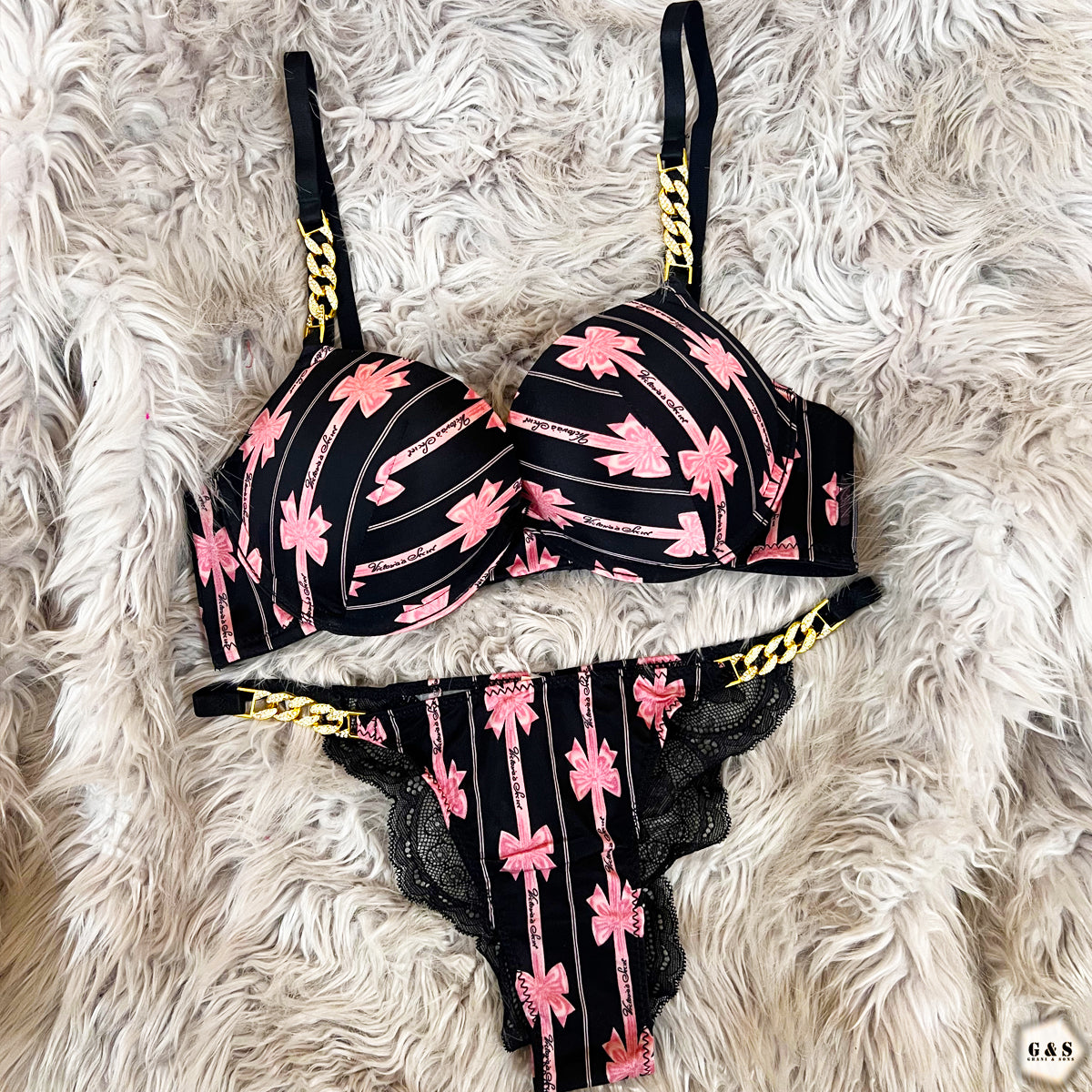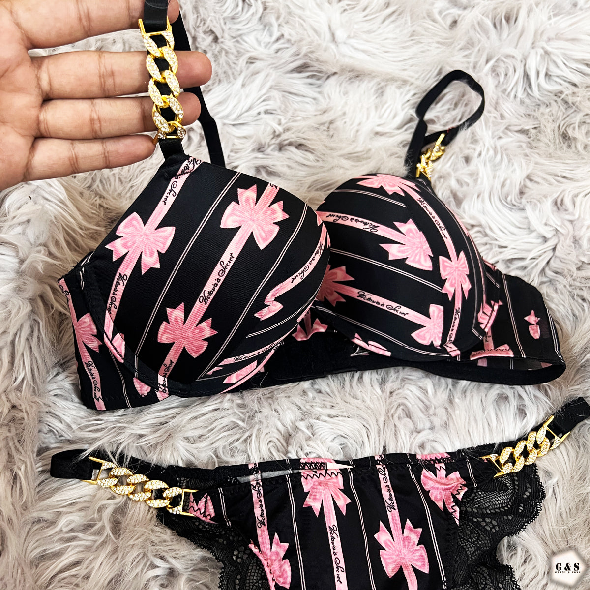 Stones Chain Design Printed Pushup Bra With T-Panty Set
